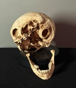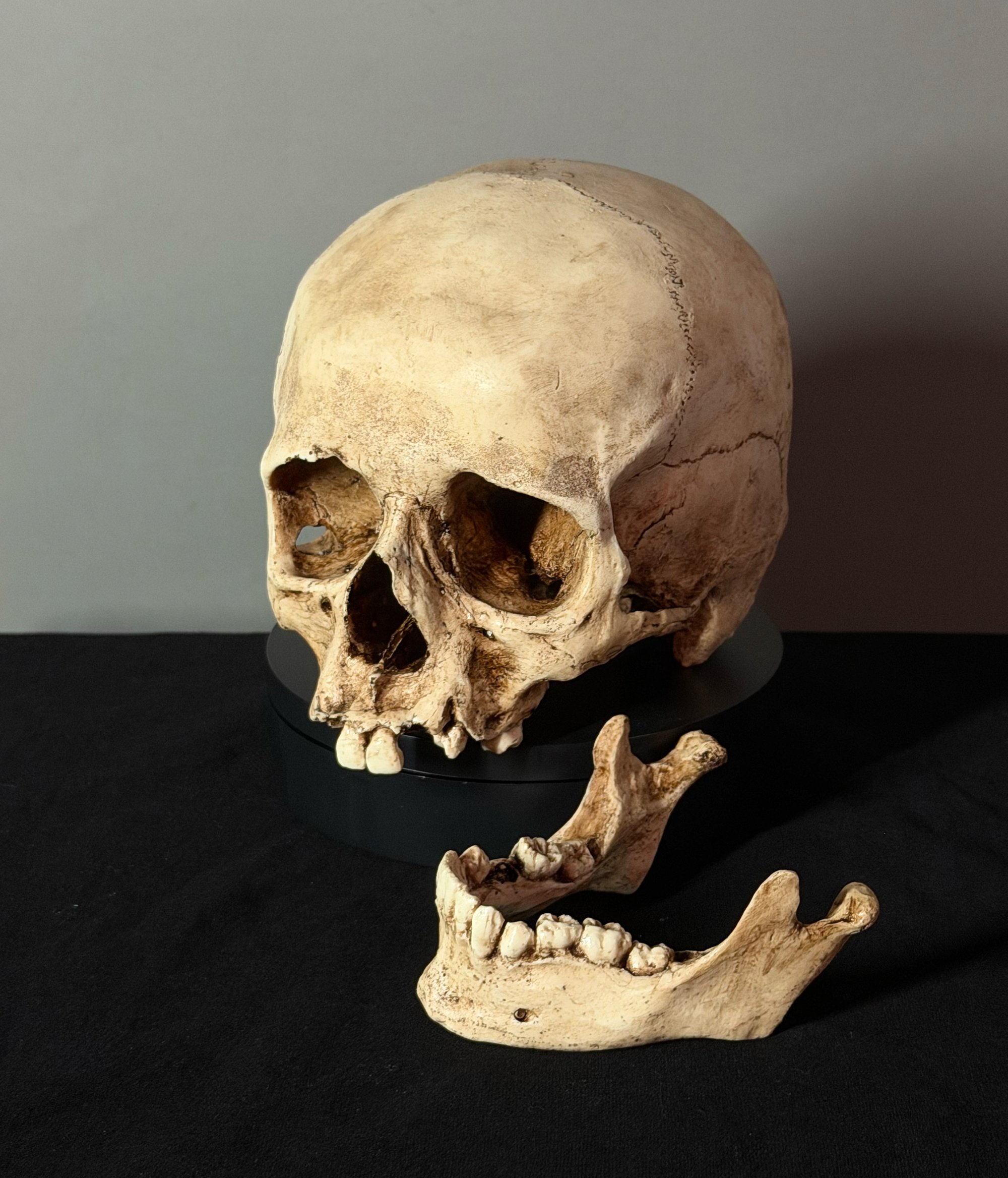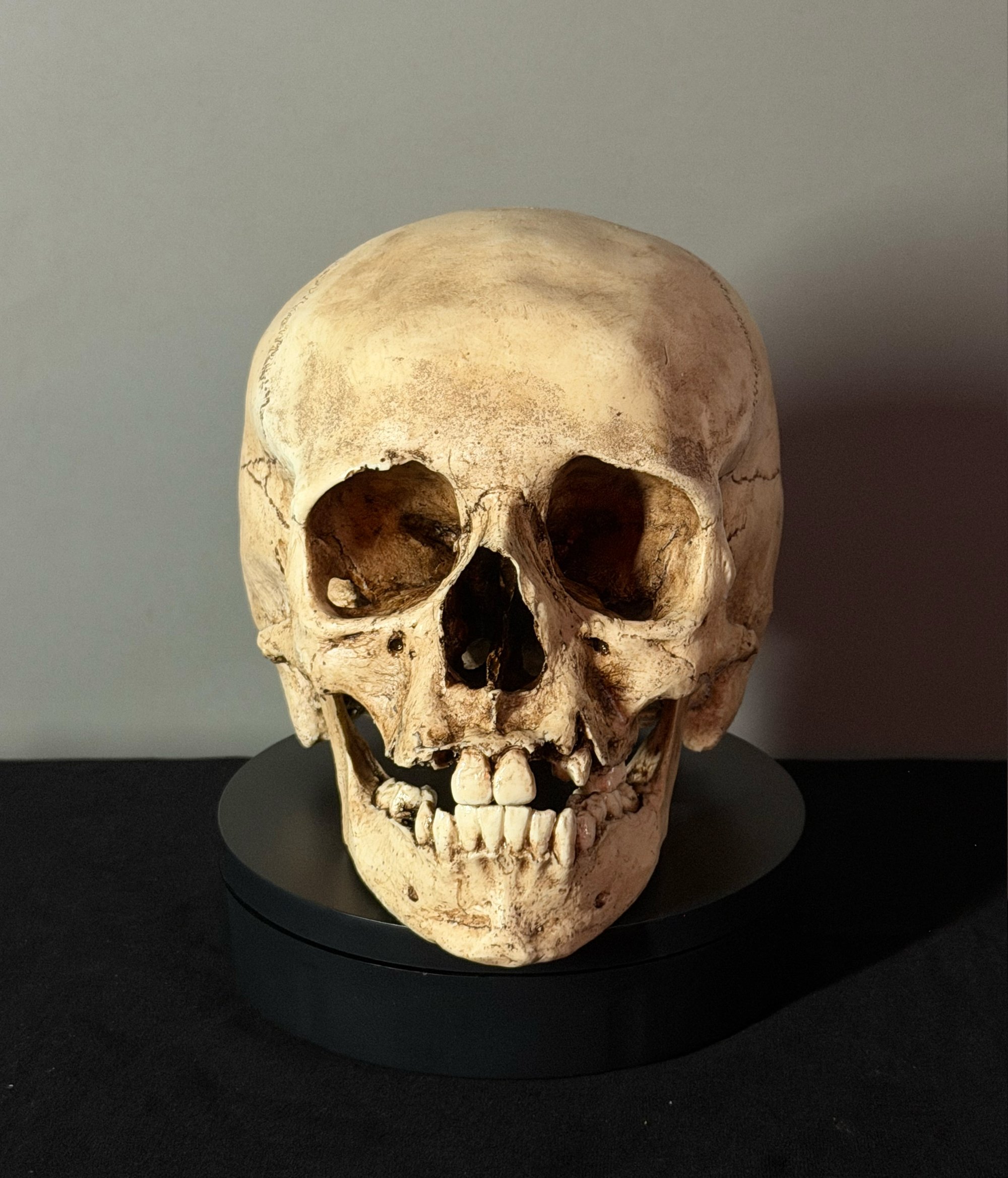 Adolescent human skull replica, cast in durable urethane plastic and hand painted,